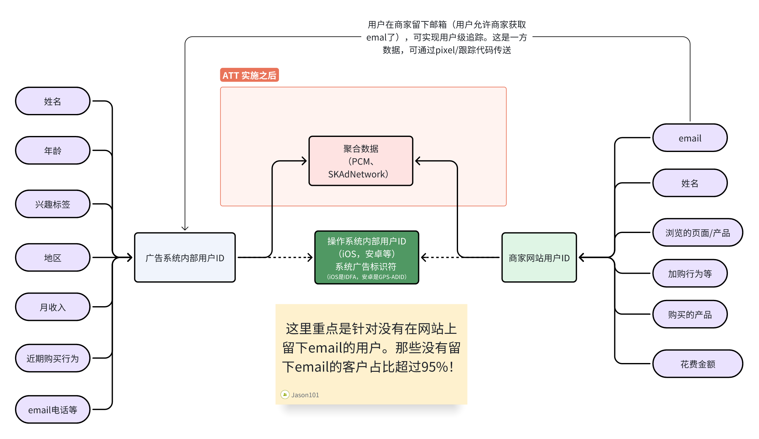 IDFA 和 GPS-ADID 分别是iOS系统和安卓系统针对客户的广告标识符,可以理解为身份证号。我们以Meta 举例,看一下一个客户从meta进入网站内部完成购买的过程,Meta 系统里围绕内部Meta user id存储大量用户信息,这个用户A 使用苹果手机,在Facebook 上看到了一个广告,然后点击进入到了商家网站(shopify系统)上,这时候iOS系统将这个用户IDFA + 站内一系列行为数据通过 Facebook Pixel 传输给Meta,当然此时shopify系统本身也会给用户一个唯一ID 我们称之为shopify user id,一样带着各种行为数据。