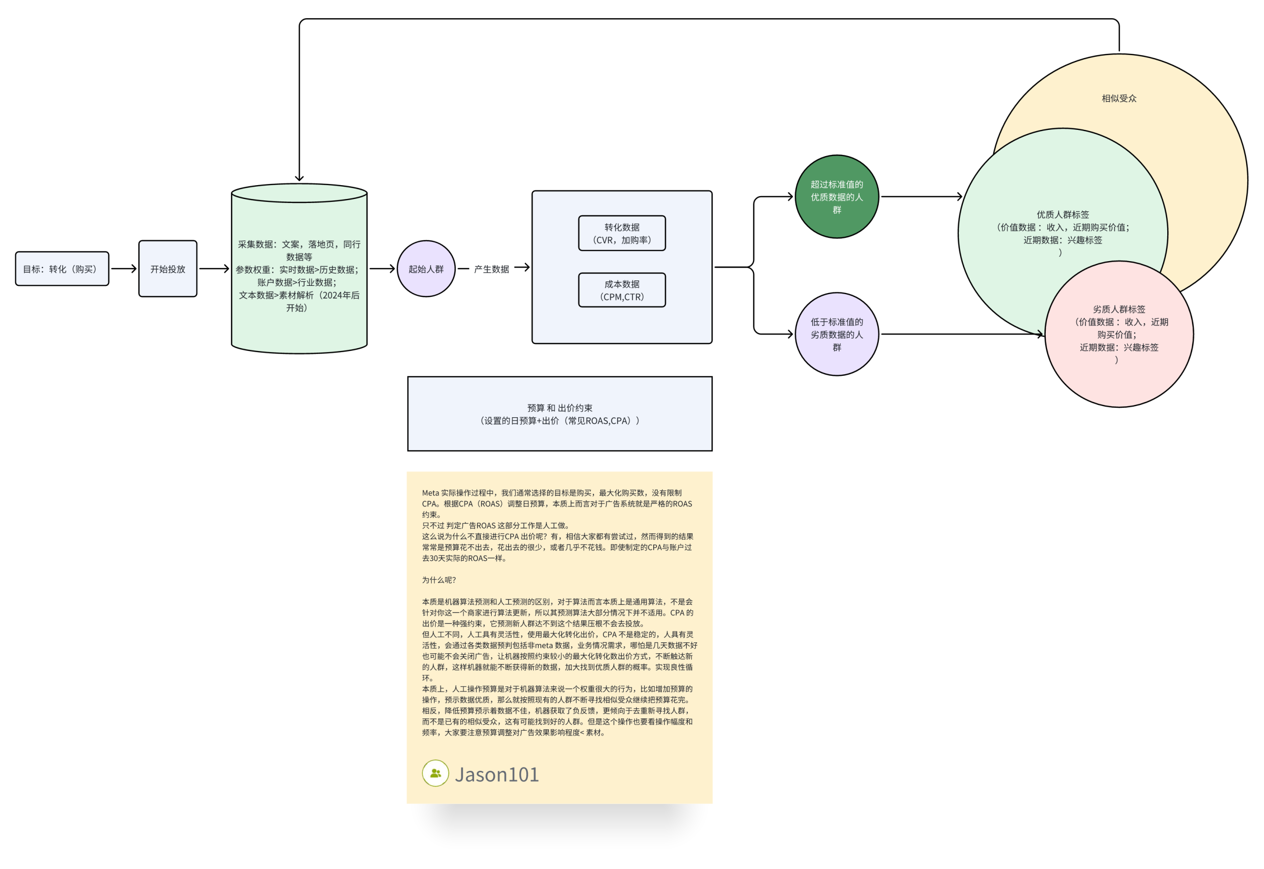 本质上广告投放人群的时候,广告系统一边在做:在利用商家已有的转化数据(整个行业数据+用户本身在meta 系统内数据)去寻找新的人群A B C,并分别预测这些A B C人群价值,假设排名是A1 B2 C3。