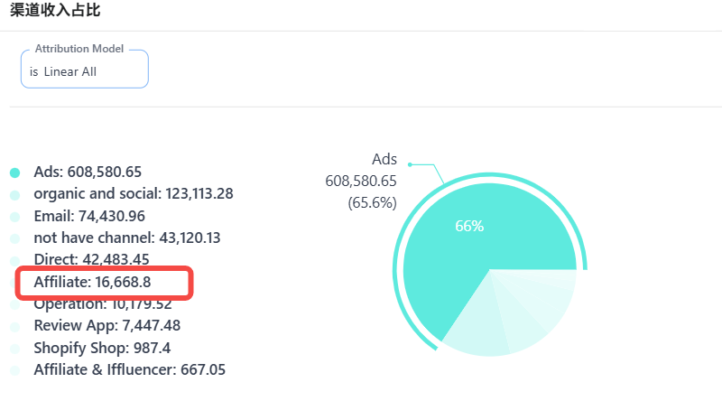 Last click归因造成无法客观评估各渠道对整体业绩到底有多大功劳,再往下就涉及到利益分配了。各渠道之间都只看自己的后台,下图左边使用TA 归因,affliate渠道销售额高达4万美金,低于 operation(站内活动,客服,相关插件带来的),但实际上LA 模型下,其功劳高于operation 60%以上呀。