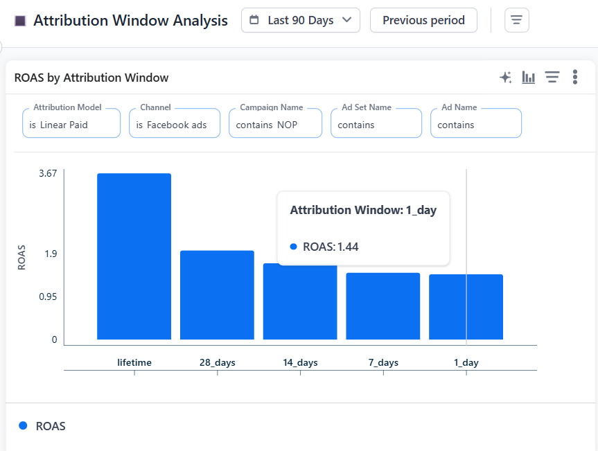 所以对于广告平台来说,加购是个非常重要的转化行为。如果说你是行业TOP5以内的,或者PMAX 广告中展示份额占比超过20%(可以更高),那么投放加购广告是最合适的,因为市场占有率高,渠道铺的广(SEO,KOL,联盟,EDM等都做的很好了)(也就是加购-购买成功率高)使用lifetime归因,这个加购广告最终转化ROAS 实际是很高的。下面就是一个行业top 商家的数据,90天,采用Linear Paid 归因,facebook ads,非购买广告。 归因窗口1天ROAS=1.44,liftetime(实际上是90天) 归因ROAS=3.67,归因延迟乘数=3.67/1.44=2.55。是不是很变态?!也就是说,当天ROAS是1,90天之后ROAS 就是2.55!