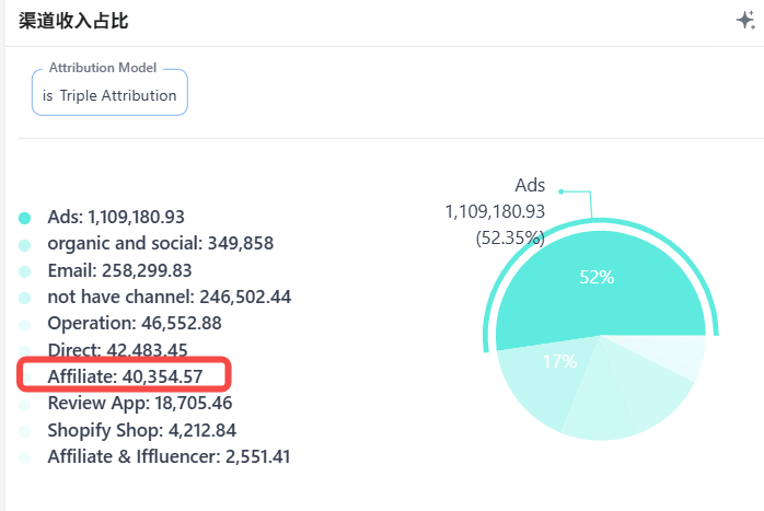 Last click归因造成无法客观评估各渠道对整体业绩到底有多大功劳,再往下就涉及到利益分配了。各渠道之间都只看自己的后台,下图左边使用TA 归因,affliate渠道销售额高达4万美金,低于 operation(站内活动,客服,相关插件带来的),但实际上LA 模型下,其功劳高于operation 60%以上呀。