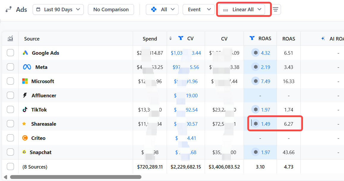 这种归因模式,会造成对单个渠道功劳的判断出现错误。看下图,是针对联盟渠道的不同归因,ROAS 的差异。